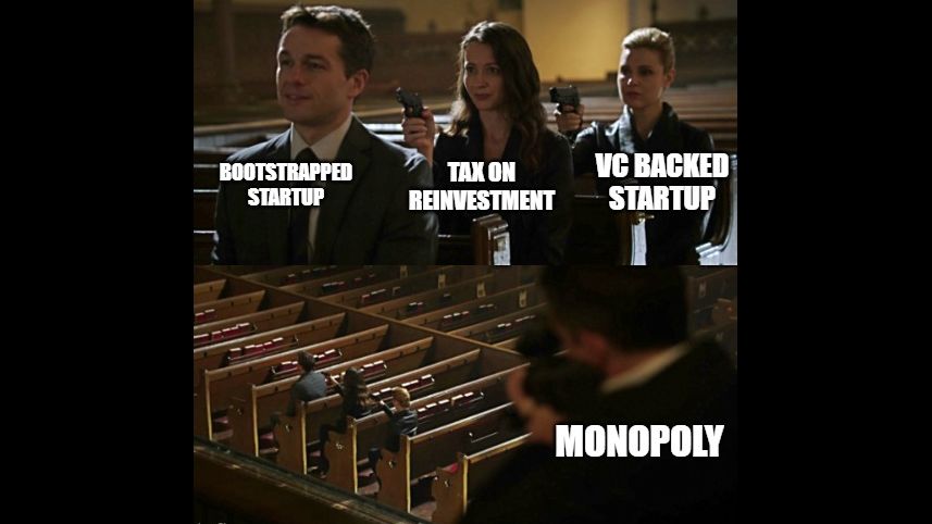 Three years ago, when we started making profit as a bootstrapped startup, I was stunned by how little money I could reinvest in my own company compared to a funded competitor. We paid ourselves 20% of the profit and paid 40% in taxes and reinvested the rest i.e. 40% into our business. Meanwhile, a VC-backed competitor could show losses and invest 100% of the revenue plus the $10 million or $50 million they raised from investors. In this essay, I'll show you how screwed up the incentives are for bootstrapped companies and what we can do to fix this.