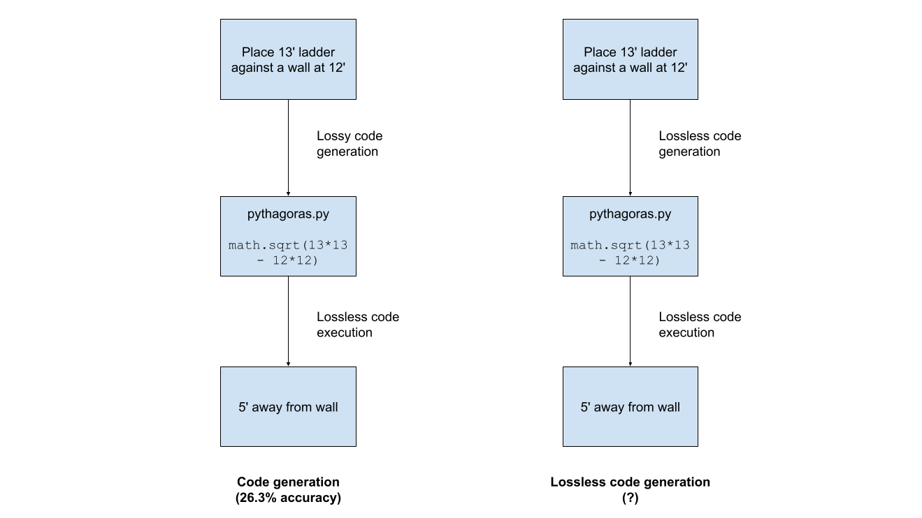 So the question becomes: how do you improve code generation accuracy? How do you convert place a 13' ladder against a wall at 12' into math.sqrt(13*13 - 12*12) with high reliability?