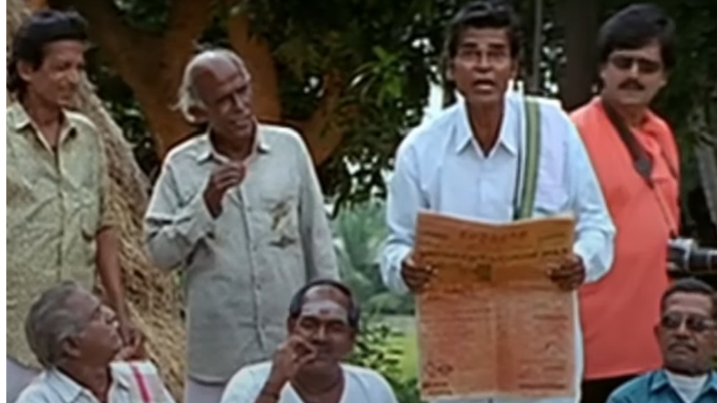 (A guy reading old newspaper finds out, Gandhi is dead)
